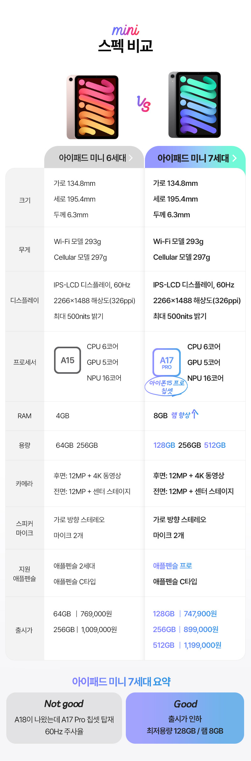 아이패드 미니 6와 비교했을 때, 7세대는 여러 면에서 개선된 점이 많아요. 특히, 프로세서와 RAM의 업그레이드가 눈에 띄는데요. 아이패드 미니 6는 A15 칩을 사용했지만, 7세대는 A17 Pro 칩을 탑재하여 성능이 크게 향상되었어요.