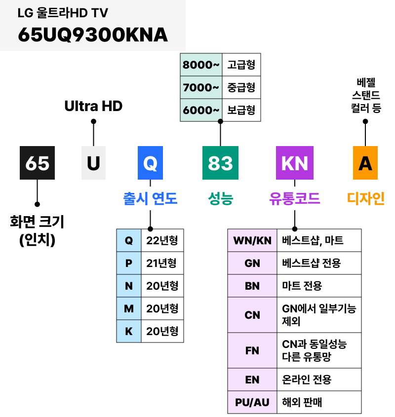 LG TV의 모델 코드는 다양한 정보를 담고 있습니다. 예를 들어, "65UQ9300KNA"라는 모델 코드를 보면:
